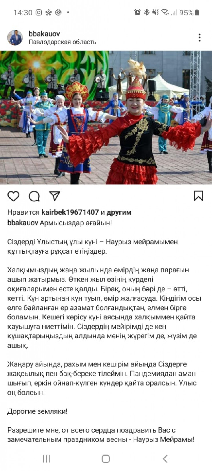 "Но в жизни бывает все, и надо пережить это, смотреть в будущее, ценить то, что есть. …Я всегда переживал за судьбу родного региона и своих земляков. Как человеку, который родился, вырос и всю жизнь прожил в Павлодарской области, мне важно, чтобы в нашем родном краю царили мир и благополучие. Поэтому искренне надеюсь, что новый год для каждого из нас будет стабильным, оставив трудности позади. В праздничный день Наурыза от всей души желаю вам крепкого здоровья и семейного благополучия, добра и счастья! Пусть весна радует вас своим теплом и вселит в каждого надежду на лучшее, веру в успех. Каждый из вас, дорогие земляки, заслуживает только хорошего. Пусть же этот светлый праздник подарит вам все это. Наурыз құтты болсын!" - говорится в поздравлении на странице в Instagram, на которую подписаны почти 32 тысячи подписчиков.