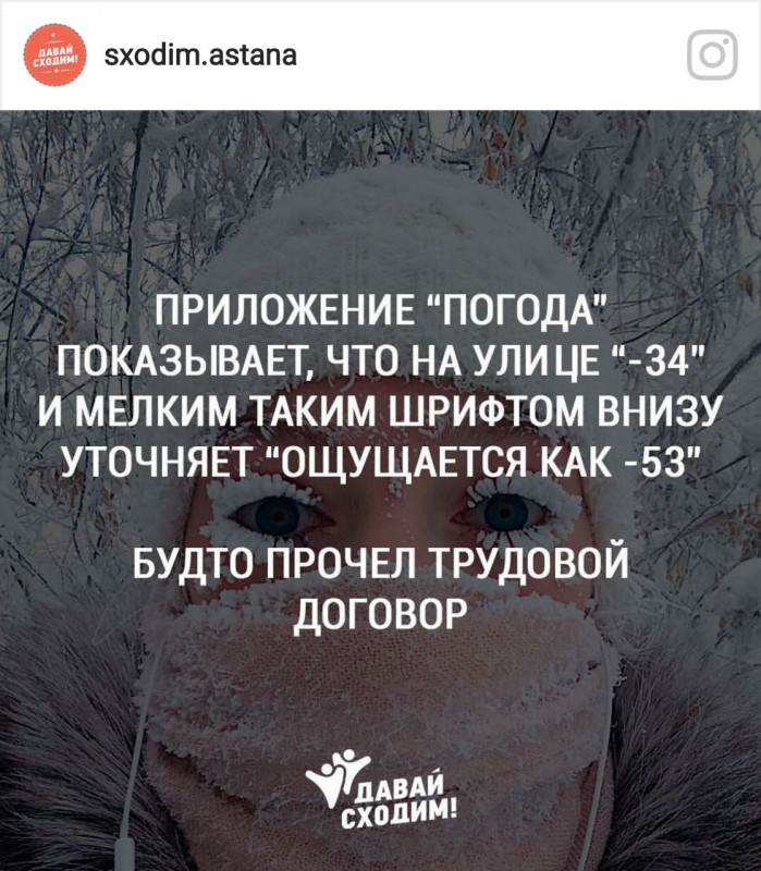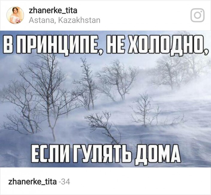 В Астане сильный мороз. По сообщению синоптиков, в период с 23 по 26 января ожидается ночью -35...-40 градусов, днем -27...-32 градуса. Некоторые жители столицы восприняли похолодание с юмором, передает Tengrinews.kz