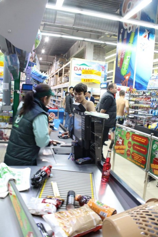 Необычные покупатели были замечены в одном из гипермаркетов Алматы, передает корреспондент Tengrinews.kz. Всеобщее внимание они привлекли благодаря тому, что были одеты, мягко говоря, не по погоде. Группа молодых людей, с голыми торсами, расплачивалась на кассе, где и были засняты на фото очевидцами.