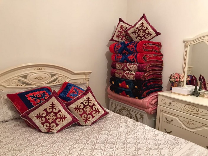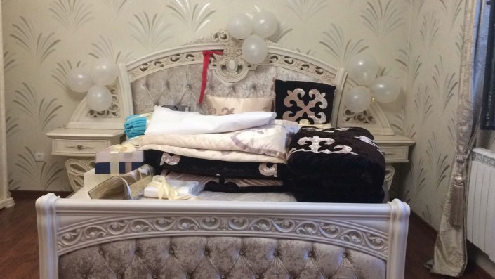 "Кит-митсіз деп келістік. Сырға салды. Жасауды Бішкектен алдырдық. Көрпе, жастық, шапан. Себебі онда тігінмен айналысатын адамдар бар. Тапсырыспен тігеді. Төсейтін оюланған көрпелер, жастықтарға чехолдар алдырылды. Ал ішіндегі мақталарды анам өзі жақсы мақталар алып, тігінші алдырып, өзі қарап отырып тіктірді. Махаббат көрпесі деген бар, жастық бар. 4 жастық келді. Төсек-орын алдық, ең бастысы сол. Сосын оюы бар сандық алдық", - дейді Гүлдейжан.