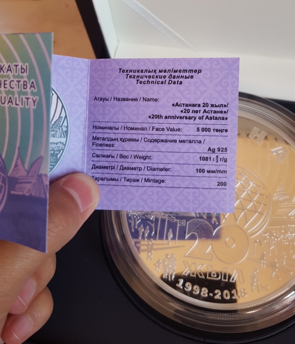 Продавец опубликовал фотографию паспорта изделия, где говорится, что монета номиналом 5 000 тенге выполнена из серебра 925 пробы, имеет вес 1 081 грамм и диаметр 100 миллиметров.