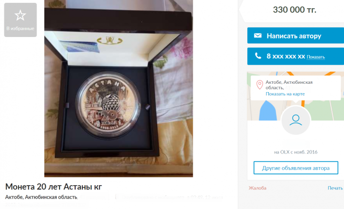 Юбилейную серебряную монету Национального Банка "20 лет Астаны" весом более килограмма продают за 330 тысяч тенге. Продажу открыли на одном из сайтов частных объявлений, передает Tengrinews.kz.