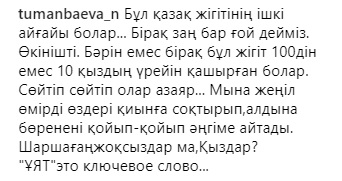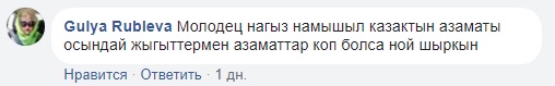 "Бұрын батырларымыз жерді жаудан қорғаған! Бүгінгілер камшымен жезөкшені қуалап жүр, осы "батырлығын" рахаттана камераға түсіреді, қорқыныштысы - оның ісіне қолдау білдіріп, қошемет көрсеткен жұрт. Қоғамның кері кеткенінің айқын мысалы! Құқық қорғау органдары бұған бағасын беріп, қоғамдық шектен шыққан жағдайға қатысты пікір білдіреді деп үміттенемін", - дейді Алагөзова.