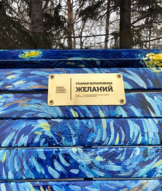 "Волшебная" скамейка находится в сквере "Керей және Жәнібек хандар". Такую красивую именную скамейку установили ученики художественной школы "Индиго" в рамках благотворительного марафона "Впиши свое имя в историю столицы", который стал уже очень популярным среди жителей Астаны", - добавил Арман Турлубек.