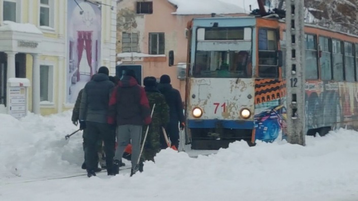 Особенно остро стоит вопрос движения трамваев: вторые сутки они не могут выйти на линии, так как рельсы забиты снегом.