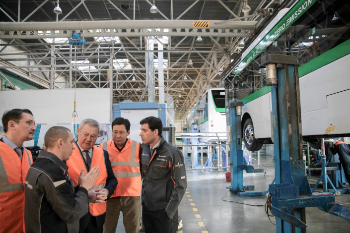 Представители акимата Нур-Султана посетили завод "СарыаркаАвтоПром" с целью ознакомления с производством электроавтобусов. На конвейере завода презентовали процесс изготовления автобусов, а также их комплектацию.