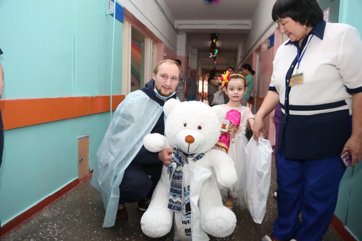 Одновременно с поздравлениями от хоккеистов детвору развлекали аниматоры из Молодежного инструкторского центра. Герои мультфильмов дарили маленьким пациентам отличное настроение.