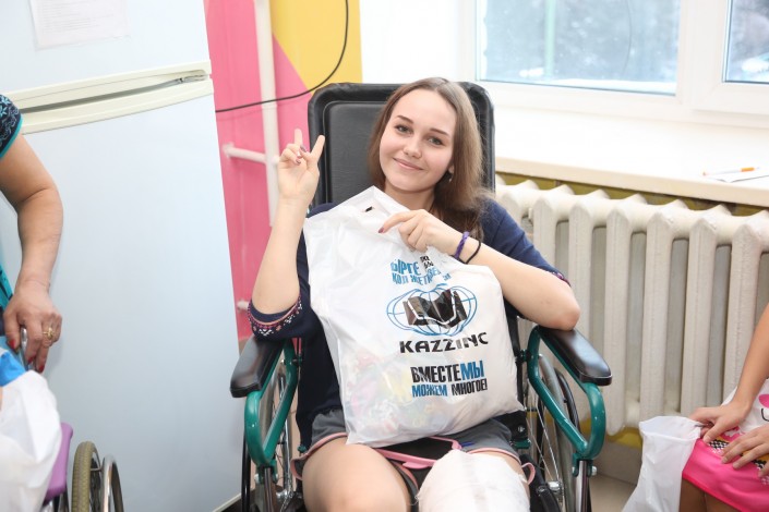 Помимо плюшевых медведей, каждый ребенок получил сладкий подарок от компании "Казцинк".