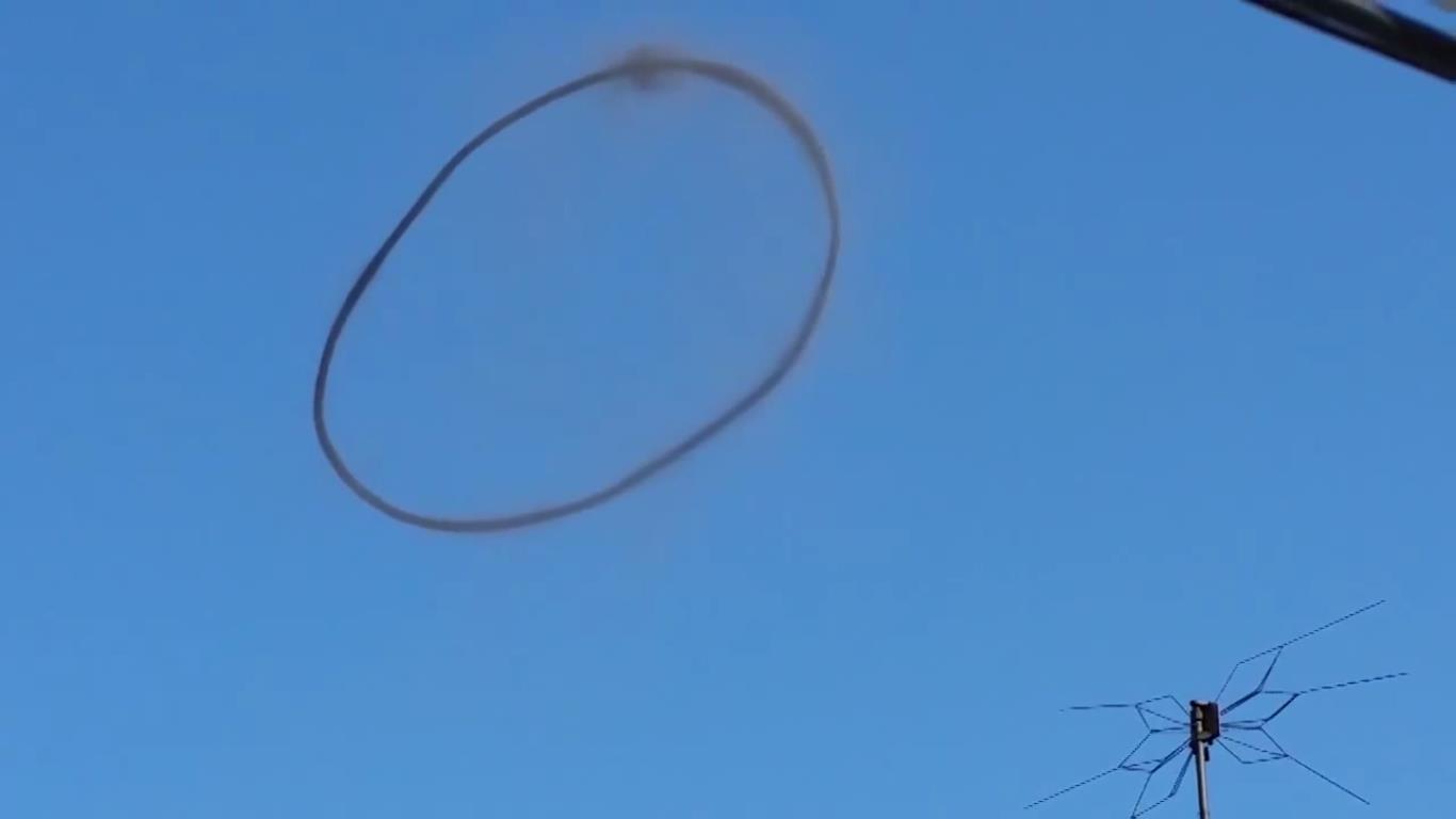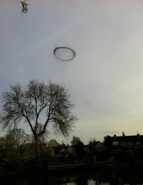 Отметим, что подобное явление в апреле 2014 года (ровно год назад!) наблюдали в небе над городом Ройал-Лемингтон-Спа в центральной Англии. О странном черном кольце, напоминающем кольцо дыма от сигары, тогда писали многие британские СМИ.