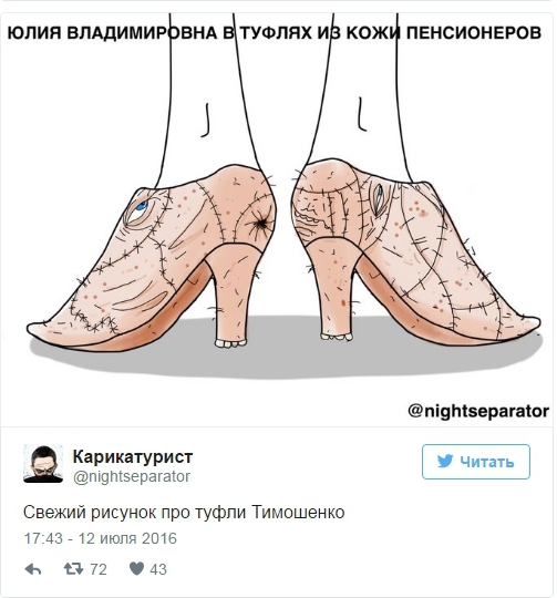 Выбор обуви Тимошенко вызвал массу возмущений и издевок среди пользователей социальных сетей. В частности, некоторые из них начали шутить, что туфли сделаны из кожи самой Тимошенко либо из кожи пенсионеров.