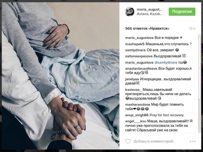 Вчера на своей странице в Instagram Мария Пятина разместила фотографию девушки, лежавшей на больничной койке. Ее друзья, знакомые стали ей желать скорейшего выздоровления.