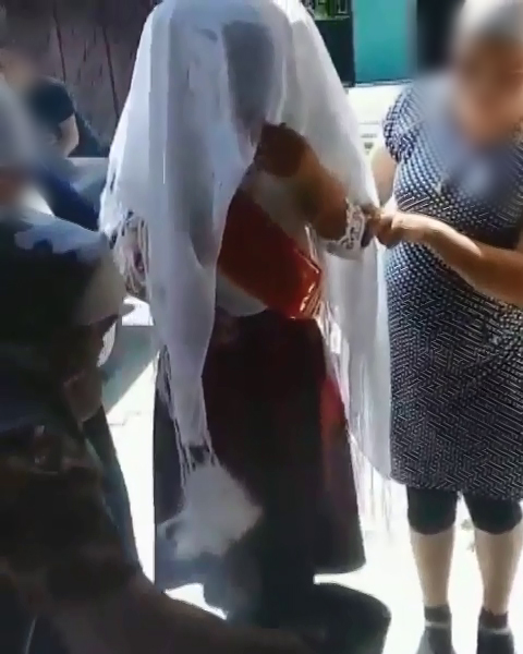 На кадрах снято, как девушку в белой кофточке и с красной лентой "Жас тулек", покрытую белым платком, заводят в дом. Ее за руки поддерживают две женщины. Невесту встречают адраспаном.