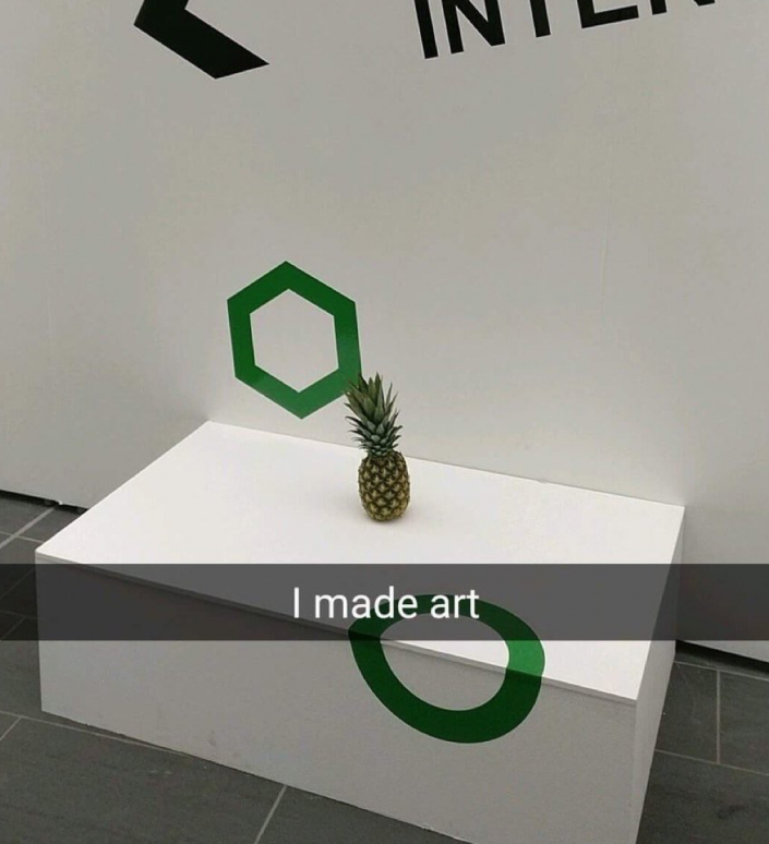 По данным СМИ, ананас принес студент по имени Руиари Грей. Он решил подшутить над посетителями галереи и поставил фрукт в центре пустого стола.
