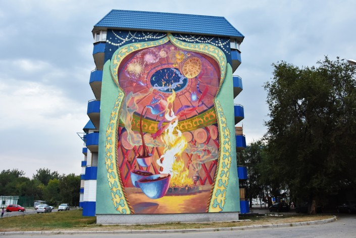 Другие участники команды Repas - Recon - Айдар Джусамбаев и Rusel - Руслан Гилязов изобразили на своем фасаде работы казахстанского художника-графика Расильбека Естемесова, у которого очень интересный и самобытный этно-стиль. Ребята пошли дальше и сделали коллаж из его работ, ведь так сложно выбрать что-либо одно из такого многообразия образов и сюжетов.