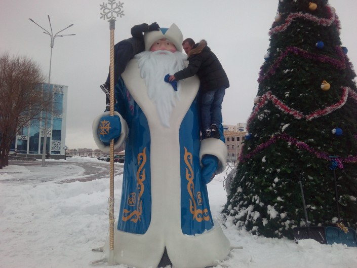 Сегодня скульптуру установили перед недавно открывшимся Домом дружбы на Юго-Востоке Караганды. Дед Мороз со светящимся посохом поставили около елки. Авторы конструкции тщательно вытерли каждый сантиметр своего "детища" и даже поверили скульптуру на прочность, встав на руки сказочного персонажа.