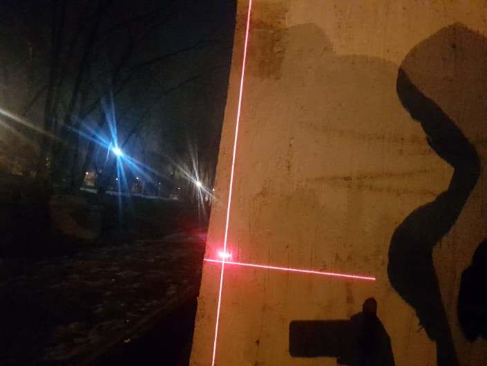 Один из жителей работает архитектором. Он принес лазерный прибор, который измеряет перпендикулярность стены дома к земле. После замеров жители дома предположили, что у дома есть отклонение примерно на 25 сантиметров.