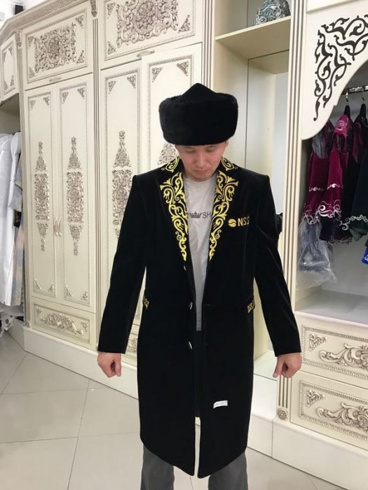 "Чапан сшит сотрудниками дома моды "Нур-Шах". Он изготовлен из велюра, так как на нем узор вышивается красиво. Мы работали с представителем заказчика, главным требованием было сшить чапан как удлиненный классический сюртук, с английским воротником, карманами, со строгим казахским узором и изображением в центре солнца с лучами, под которым - парящий орел. Это был индивидуальный и неповторимый заказ", - поделилась Нурджамал Нурпейсова.