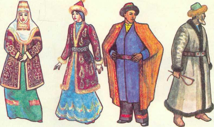 Шал, қариялар шапан, ішік, бешпент, сырма шалбар, ақ жейде, дамбал киіп, аяққа саптама етік, кебіс-мәсі киген.