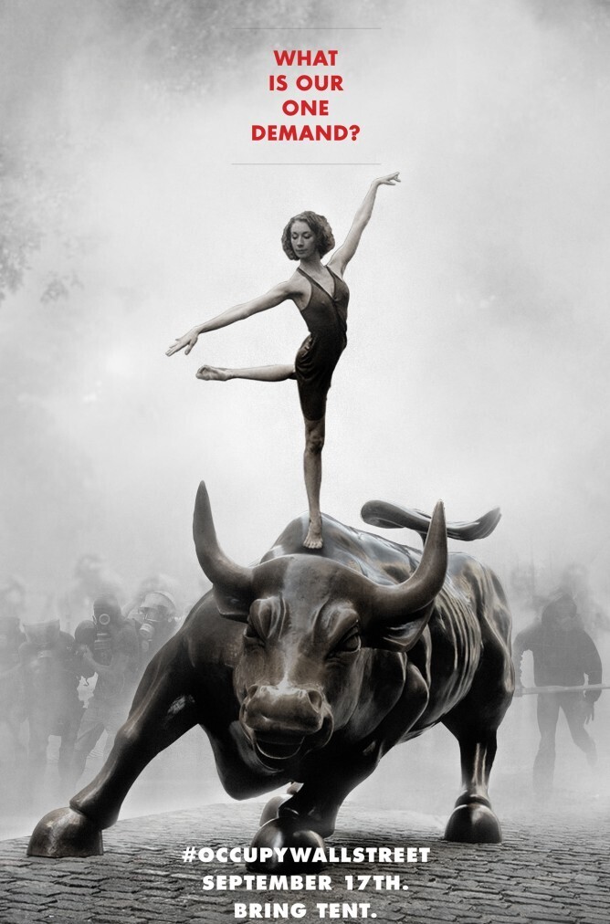 Это не было стихийным бедствием в центре Нью-Йорка. Это была ювелирная работа Adbusters. Журнал разослал подписчикам постер, который сегодня висит в музеях современного искусства и в сердцах миллионов. На нем балерина замерла в безмолвном пируэте на спине яростного бронзового быка – идола Уолл-стрит. Подпись: «Каково наше единственное требование? #OccupyWallStreet. Приносите палатки».