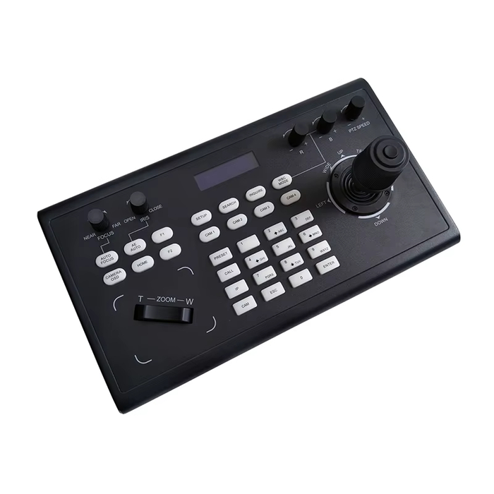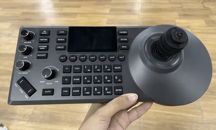 Контроллер для управления камерами, который обеспечивает точное позиционирование и контроль зума. Джойстик позволяет плавно управлять движением камеры, что важно для систем видеонаблюдения и видеопродакшена. Кнопки дают быстрый доступ к основным функциям.