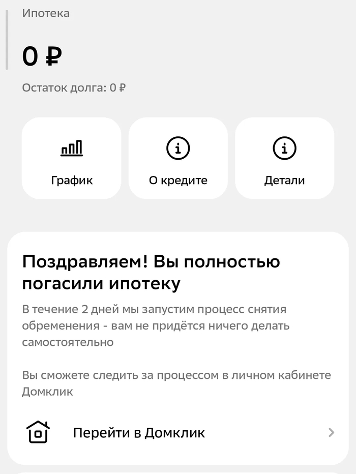 Наконец-то закрыл ипотеку. Осталось только документы все получить. Порадуйтесь за меня что-ли, можно не от всего сердца)