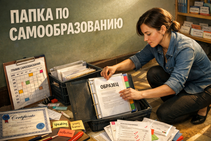 Учитель английского языка в классе собирает папку по самообразованию с разделителями, сертификатом, планом работы и материалами уроков — образец обложки статьи