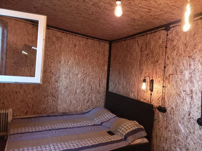 Двуспальная кровать, тоже сделали сами. Было много разных обрезков от строительства.