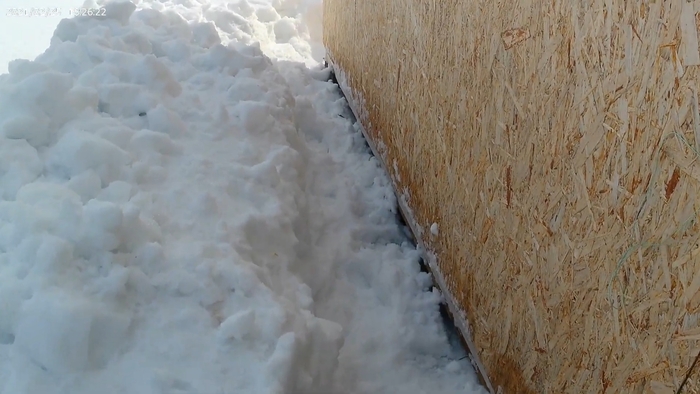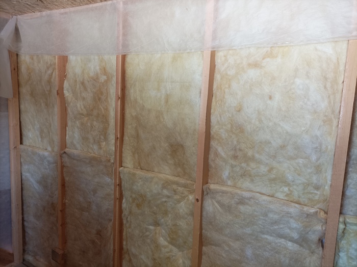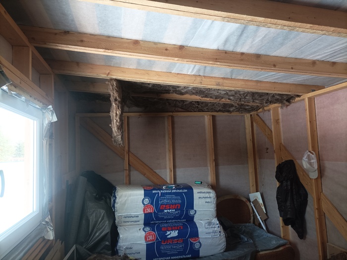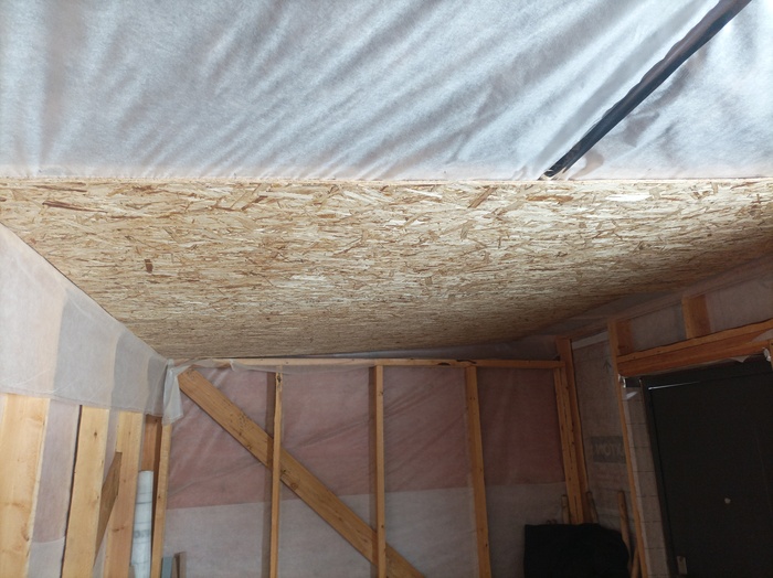 Потолок утеплялся рулонной минеральной ватой, а стены плитной. ОСБ с улицы, в качестве экономии, решил смонтировать внутри. Стыки межу плитами и щели в углах закрывал обычными плинтусами, покрашенными в черный цвет.