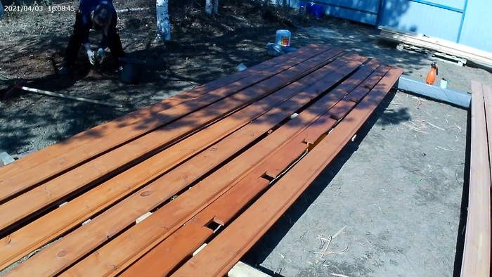 Приобрел на фабрике самую простую имитацию бруса сорта "С" и тут же на участке устроили покрасочный цех. Красили спец составом для защиты дерева - цвет махагон.