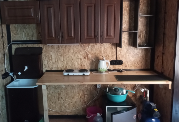 Кухонная зона представлена столешницей из мебельного щита и пары самых дешевых ящиков. Вода есть, но канализации нет. По этому рукомойник с подогревом и ведро для слива под ним. Кухонная часть, еще самая недоделанная. Нужно закрыть пространство под столешкой и разобраться с водоотведением.