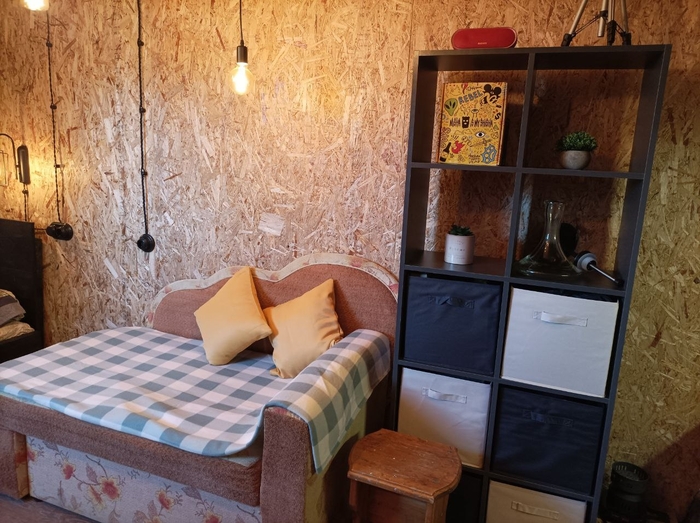 Поставлен старый диванчик для просмотра фильмов и в Леруа куплена полка с тканевыми ящиками для хранения.