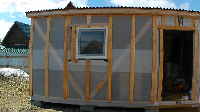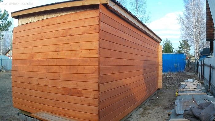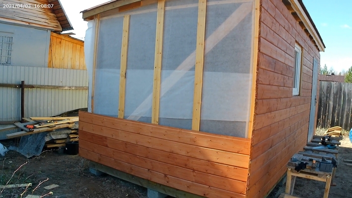 После зимы стало понятно, что обшивка внешних стен плитам ОСБ не вариант. Местами они начали темнеть от влаги, да и внешний вид не очень. Было принято решение снимать ОСБ и крепить на ее место имитацию бруса.