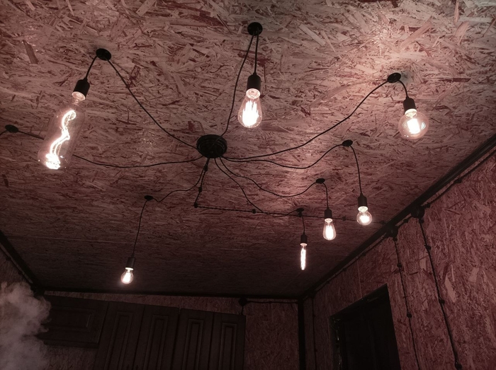 Электрику не стал делать в стенах, по этому выбор пал на ретро проводку. На маркетплейсах есть очень достойные и доступные варианты розеток и выключателей от братьев Белорусов. В качестве люстры вот такой "паук" на лампах Эдисона.