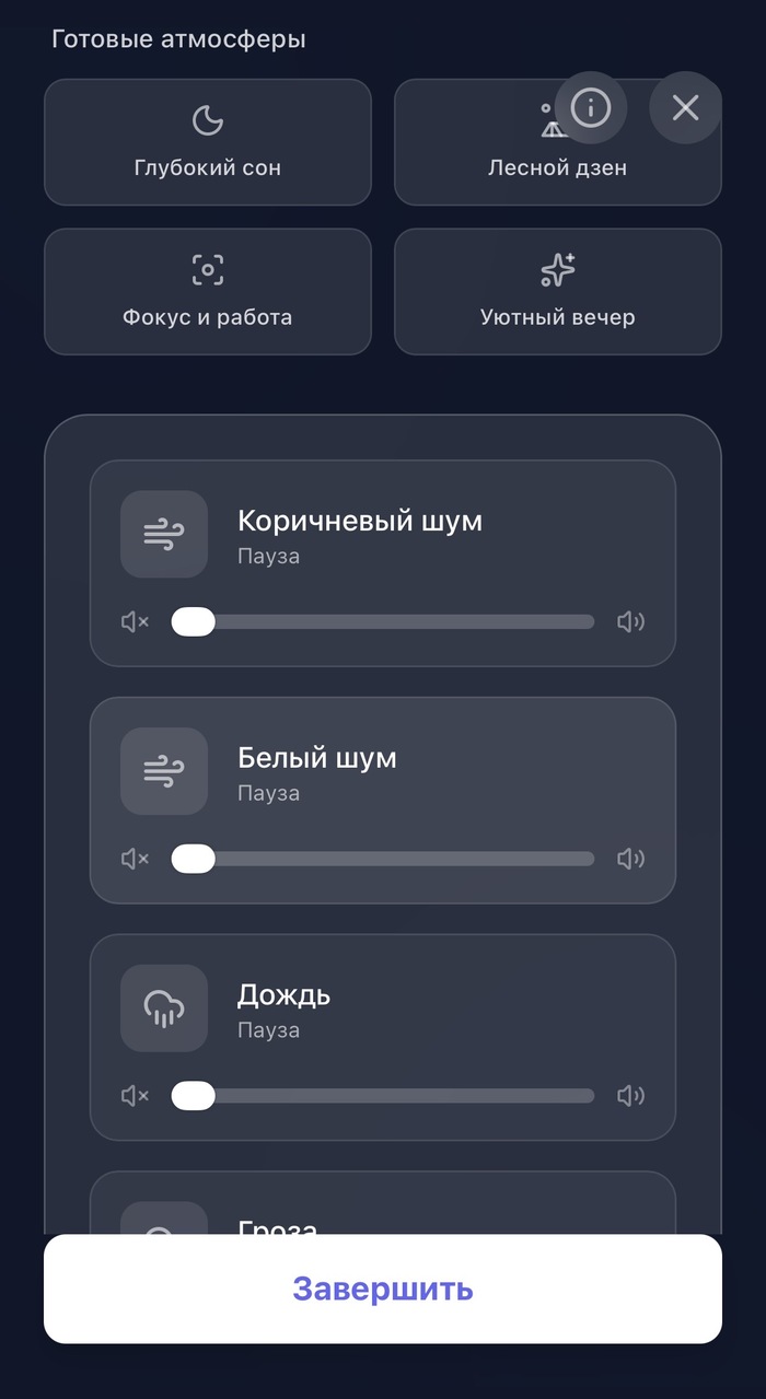 Тревога часто бьет по сну. Чтобы нормально засыпать и не отвлекаться на каждый шорох, я сделал простой звуковой микшер. В браузере можно включить фоном шум сильного дождя, добавить немного грома и наложить поверх коричневый шум (он отлично маскирует резкие звуки улицы). Это спасает, когда в голове не останавливается поток тревожных мыслей, этот же инструмент помогает сконцентрироваться на работе или просто успокоиться.
