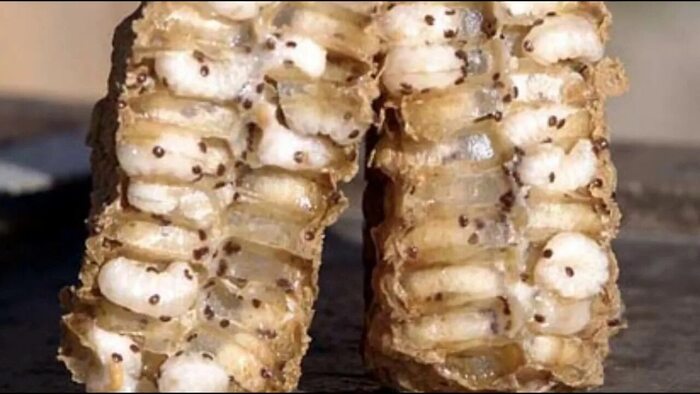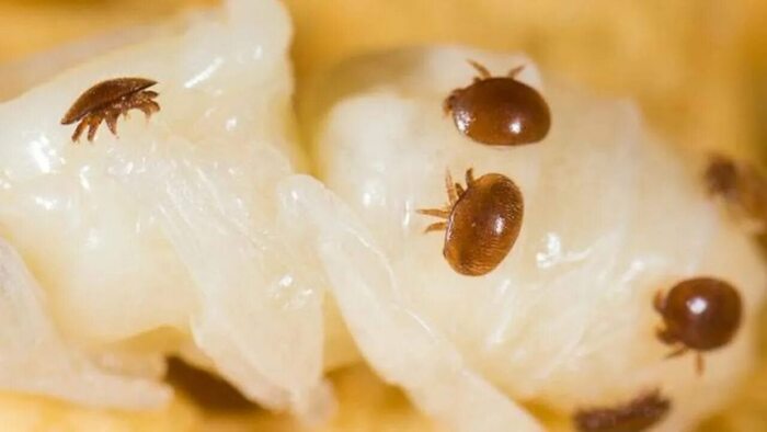 Внутри ячейки самка клеща прогрызает себе место и начинает питаться. Через несколько дней она откладывает свои первые яйца. Интересно, что первое яйцо, которое она откладывает, - это яйцо самки, а последующие - яйца самцов. Это связано с тем, что самки клеща живут дольше и они должны быть гарантированно оплодотворены.