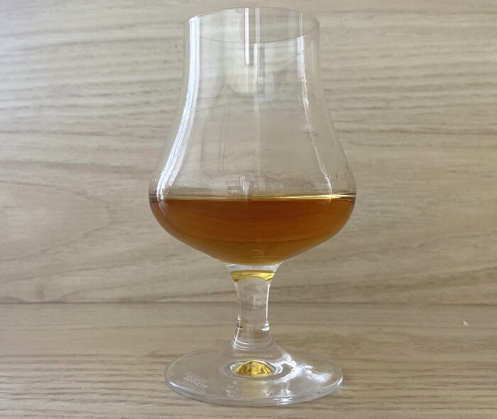 Цвет — янтарный, но без излишней темноты, без той нарочитой «черноты», которой грешат производители, добавляя в молодые дистилляты карамель. Здесь цвет скорее золотистый, средне насыщенный, с отблесками старого золота. Ножки (или «слёзки») на стенках бокала текут неторопливо, обещая нам приличную выдержку и отсутствие спиртуозной агрессии.