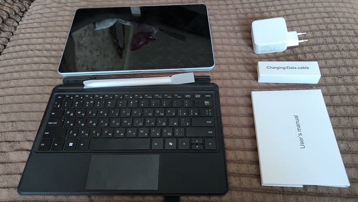 Внутри скрывается весьма богатая комплектация: сам планшет, стилус, чехол-клавиатура, мануал, зарядка, брендированные наклейки по аналогии с Apple, а также кабель Type-C. В целом, Ninkear явно поработали над айдентикой: ранее их коробки и комплектация в целом были куда более аскетичными.