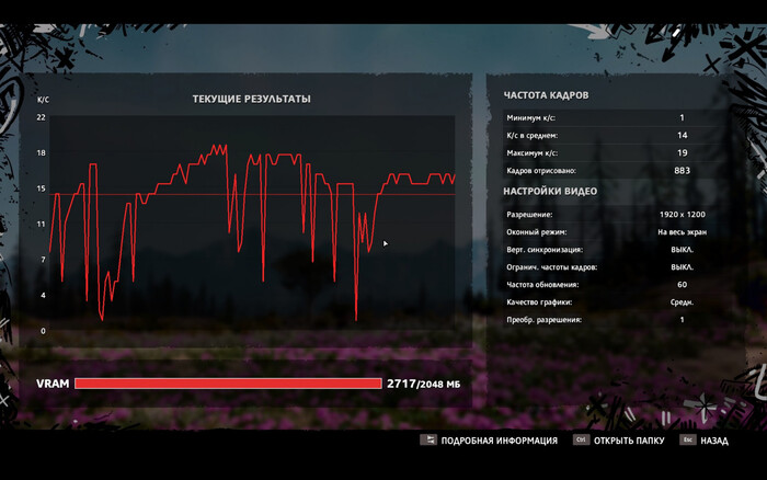 В Far Cry: New Dawn при средних настройках мы получаем около 15 FPS. При этом вышеупомянутая GTX750 тянула New Dawn без каких-то особых проблем, так что наличие дискретной VRAM очень сильно решает.