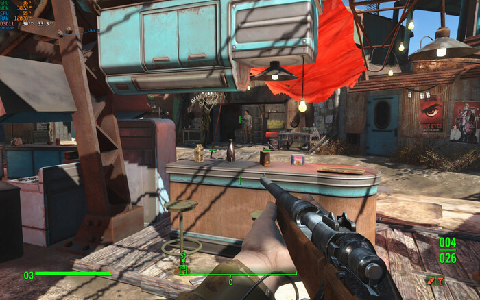 В Fallout 4 ситуация немногим лучше. В Даймонд-сити на минимальных настройках мы получаем плавающие 25-30 FPS при 2.5K, и упор, опять же, идёт в GPU. Тут главная проблема в памяти: у встройки нет своей VRAM, она вынуждена делить системную RAM с процессором. А поскольку кэш у GPU обычно не слишком большой и он постоянно должен делать выборки из ОЗУ, ему приходится делить шину с процессором и это заметно бьёт как по филлрейту (обращения записи к фреймбуферам), так и по скорости сэмплинга (чтения текстурных данных).