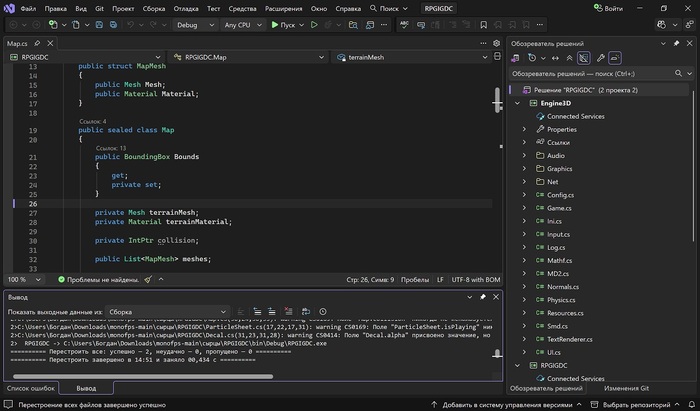 В качестве своеобразного бенчмарка, мы с вами протестируем время сборки двух проектов: моей небольшой 3D-игры, написанной с нуля в 2022 году на C#, и опенсорсного 3D-движка Urho3D, написанного на C++. Начнём с моего проекта: в игре около 3к строк кода, с кастомным движком (рендер - D3D9, звук - DSound и т.п.) и базовой логикой (загрузка уровней, стрельба, "ИИ" монстров). Время полной сборки составляет всего лишь 400мс - практически моментально!