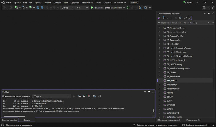Urho3D же, будучи огромным проектом, собирается за 03:25. Это отличный результат по меркам планшета в портативном режиме.