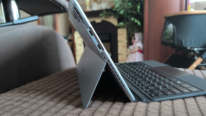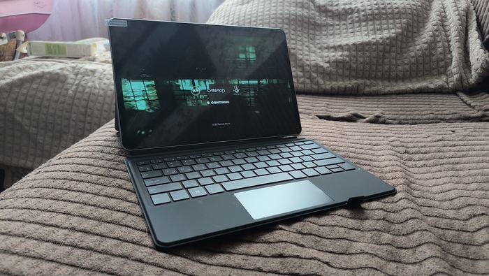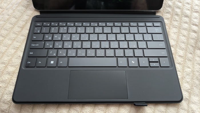 В S13 меня очень порадовала клавиатура. Она сама примагничивается к планшетной части устройства и встает в пазы, после чего устройство издаёт характерное звуковое уведомление. Тактильно клавиатура не похожа на дешевые чехлы из 2013 года: материал на ощупь приятный, ход клавиш уверенный и при этом достаточно тихий, а также есть подсветка. Тачпад тоже удобный, правда мне немного не хватает выделенных очертаний ЛКМ/ПКМ: