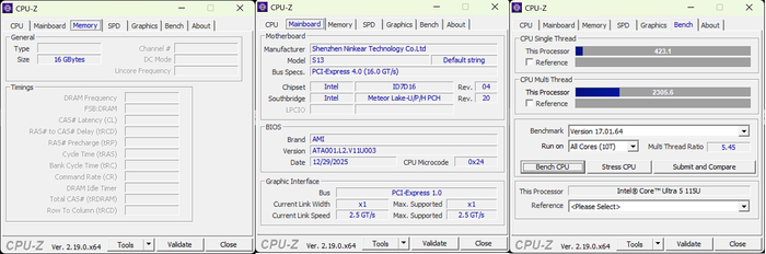 Начнем с тестов процессора. В встроенном бенчмарке CPU-Z, 115U показывает результат в 423 попугая в однопоточном тесте, и 2305 попугаев в многопоточном тесте. Судя по референсу, это уровень примерно между Ryzen 5 2600 (без X) и i5 9300H в однопотоке, и i3-1315U и i3-1215U в многопотоке.