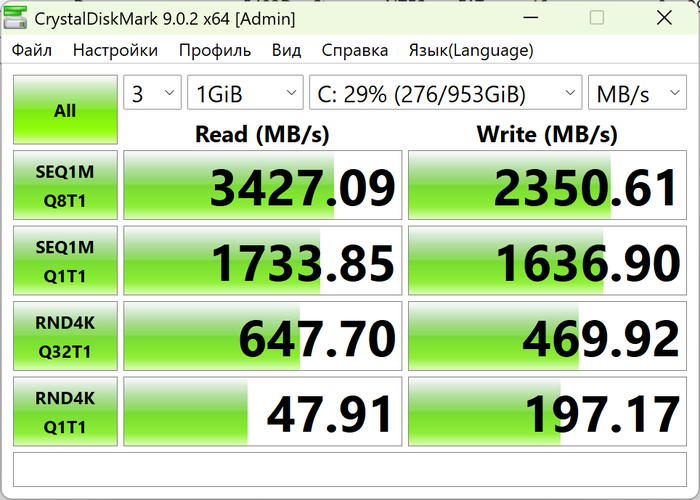В CrystalDiskMark SSD устройства тоже показывает весьма неплохие результаты. При последовательном чтении и записи блоков по 1МБ, мы получаем производительность в 3.4ГБ/с при чтении и 2.3ГБ/с при записи, а при случайном чтении 4х-килобайтных блоков, мы получаем производительность в 64МБ/с при чтении и 469МБ/с при записи. В целом это хороший результат.