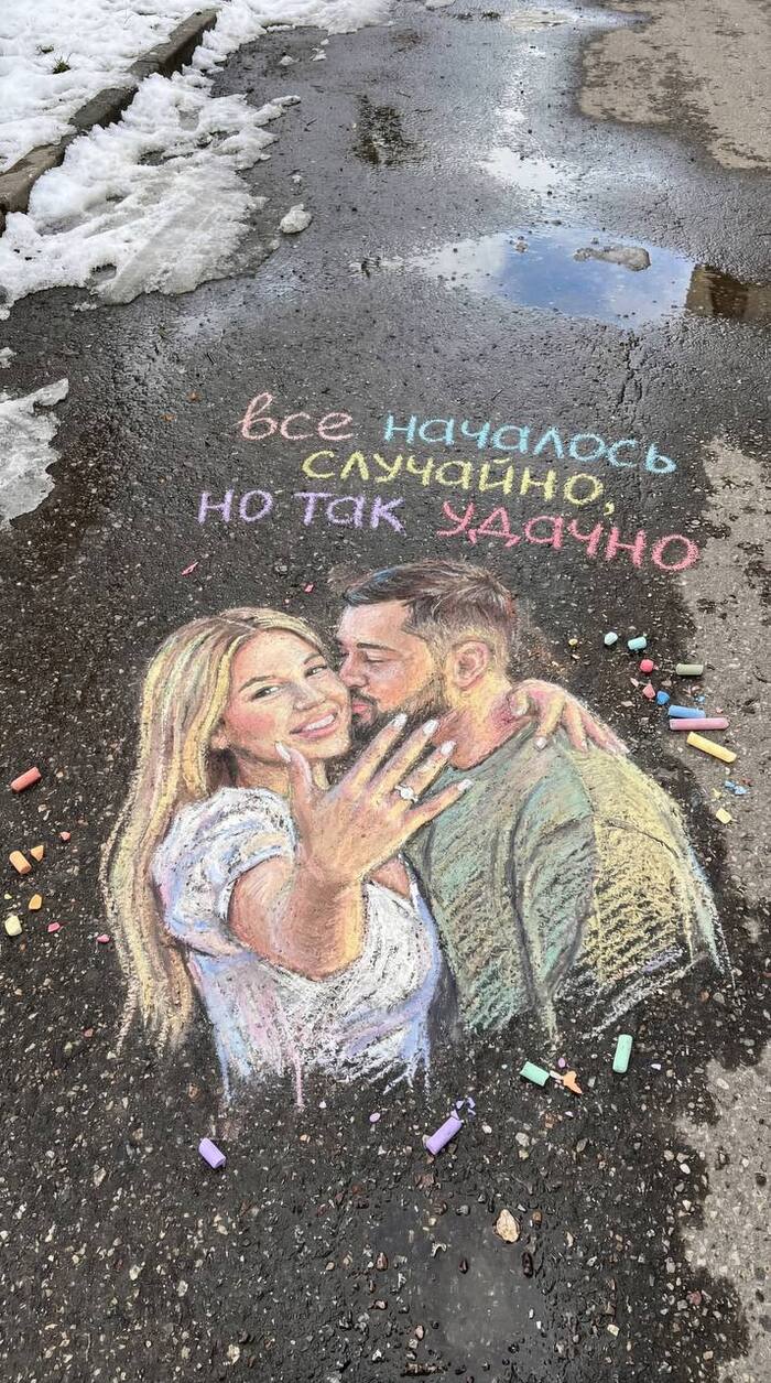 Люди с первого изображения перерисованы пастельным мелом; текст: «все началось случайно, но так удачно» написан сверху цветным мелом.