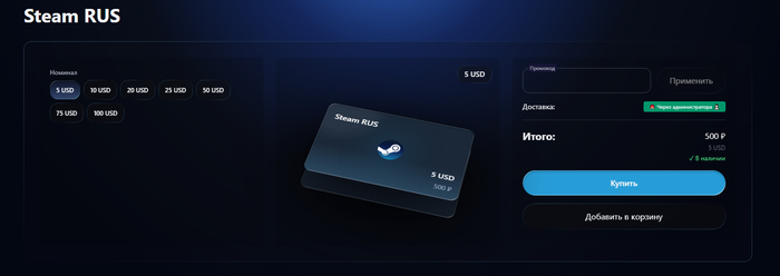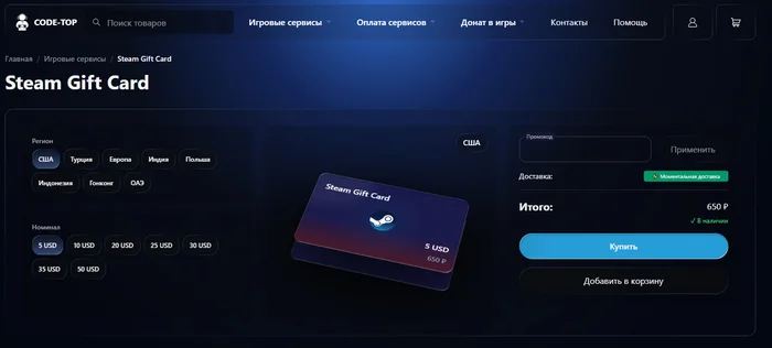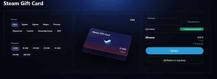 Это самый предсказуемый способ: вы получаете цифровой код и активируете его в клиенте. Через ПиплБот доступен выбор номиналов и валют без лишних формаальностей. Комиссия зависит от региона и номинала, а зачисление происходит сразу после активации.