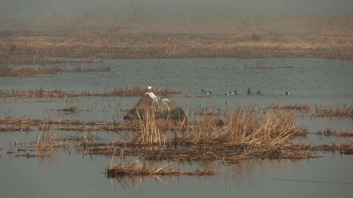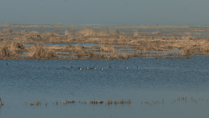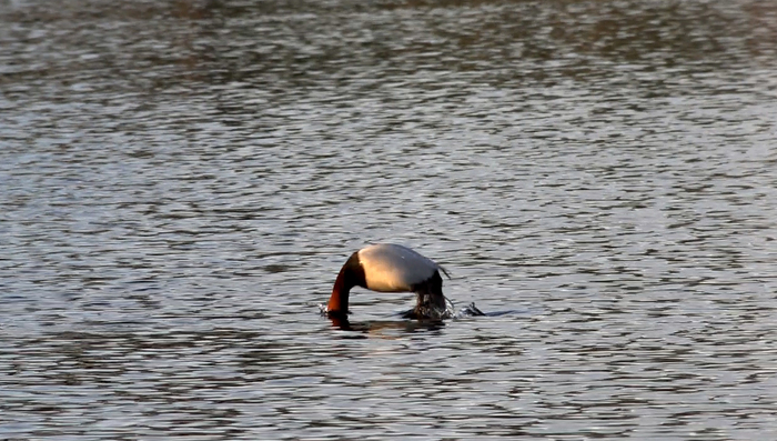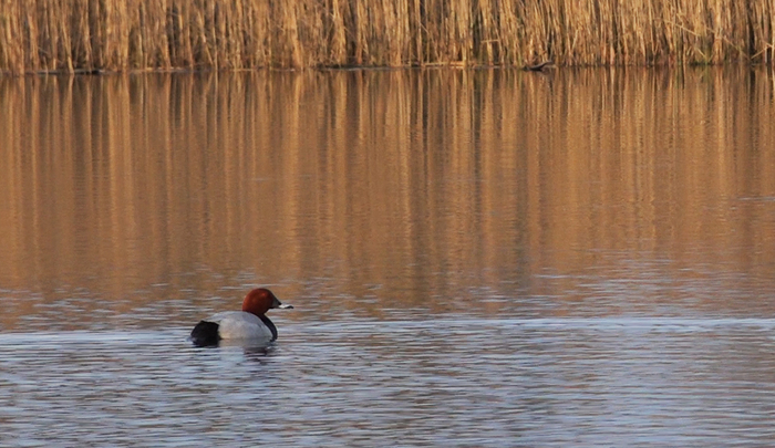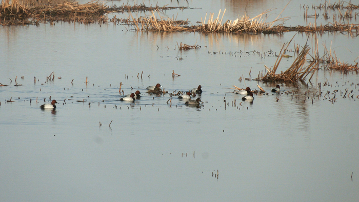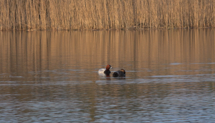 Научное их название — красноголовые нырки. У самцов в брачном наряде голова и шея каштаново-красного цвета — за что эти утки и получили своё название. Довольно часто птиц называют именно за брачный наряд самцов. Кавалеры выглядят эффектно. Грудь и хвост чёрные, тело серо-голубое, не случайно второе название этих птиц — голубая чернеть. Глаза у женихов ярко красного цвета. Самки окрашены неброско, в серовато-бурые тона. Выглядит скромно, зато сколько внимания у красавцев-женихов, да ещё и в таком количестве! Чтобы понравиться невесте, самцы красноголовых нырков совершают ритуальные брачные танцы, изящно закидывают на спину голову и при этом нежно подсвистывают. Устоять невесте не просто, и особенно сложно — выбирать, ведь один жених красИвее другого. Главное ей с этим не тянуть, ведь во время съёмки к стае присоединилась и вторая невеста. Какая ни какая, а уже конкуренция!