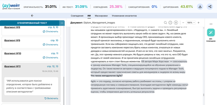 В отчете Думейт появился новый функционал, который дает возможность снимать отметку ИИ и отключать отдельные фрагменты, помеченные как ИИ-текст. Кроме этого, есть возможность выгрузить отчет последних изменений, в который войдут все комментарии, сделанные в ходе анализа и редактирования результатов проверки.