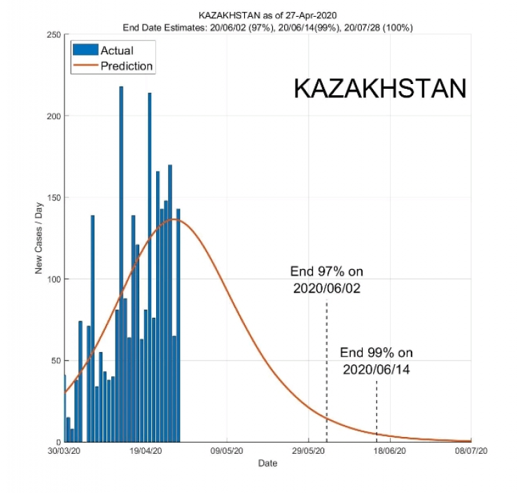 Так, согласно расчетам, пандемия в Казахстане уже прошла пик в конце апреля. Число заболеваний сократится на 97 процентов ко 2 июня, на 99 процентов - к 14 июня, а окончательно прекратит распространяться к 28 июля.