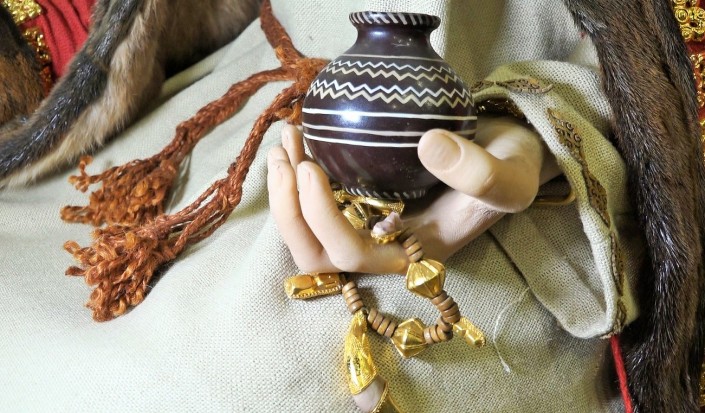 Женщина принадлежит племени саков-тиграхауда, носивших остроконечные шапки. Ее возраст - 17-20 лет. Принадлежность к знатному роду подтверждают 80 золотых украшений, две стражницы, захороненные рядом, и уникальный гребень, на котором изображена батальная сцена между сарматами и персами.